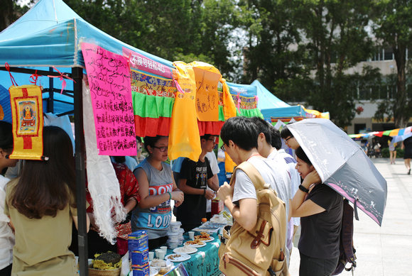精彩的藏族文化展持续了8个小时。上午还是艳阳高照,藏族学生耐着高温穿着藏装迎来送往;下午却暴雨忽至,然而他们仍坚守展览区,雨过天晴后,十几位藏族同学带领路人跳起欢快的锅庄,热烈的气氛将阴霾一扫而空。在西藏,“歌舞”并不限于舞台表演,而是“家家有舞,人人能跳”。