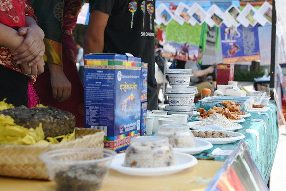藏家饮食区无疑是最热门的展区,长桌上摆满了新鲜美食供师生品尝:用青稞面和酥油茶揉成的糌粑、藏区大年初一必吃的油炸卡萨、味道浓郁的奶干和奶渣、风干的牦牛肉,还有甜茶、清茶、酥油茶和青海酸奶等特色饮品。前来帮忙的汉族学生白存霞透露,大部分食物是前一天才从西藏空运至广州,而不便运输的卡萨是借用老师宿舍制作的,糌粑则是现揉的,保证了绝对的新鲜。藏族同学们还特意准备了味道较为清新的“改良版”酥油茶,让非藏族同胞更容易接受。