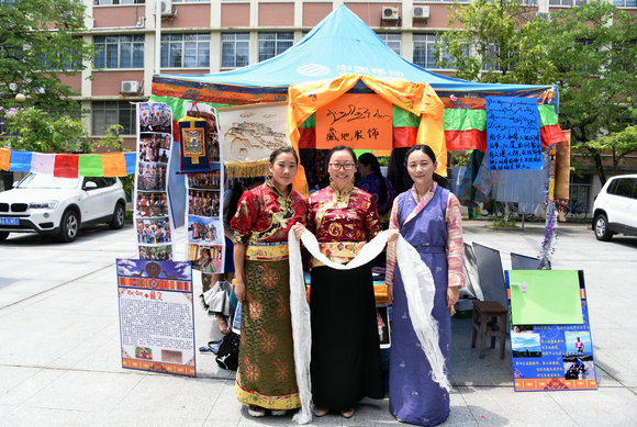 11日上午10时,“一路格桑花”藏族文化展在亲新广场拉开帷幕,藏家饮食、特色物品、藏地服饰、藏文译名和旅游攻略五个展区,全方位展示了藏族风俗文化。广场中央摆放着藏族学生亲手制作的切玛盒,金色的斗型盒子里盛着炒麦粒和糌粑,插着青稞穗、红穗花和酥油花,这是藏历新年必备的吉祥物。措加卓玛说,这是为了表达对文化节的美好祝愿。