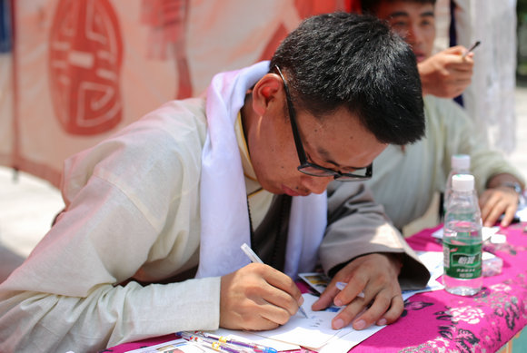 在藏文译名区,藏族同学正专注地把参观者的中文名翻译成藏文,写在精美的明信片上。旁边的旅游攻略区内,来自西藏南部的美夏早已准备好了相关资料,为参观者介绍藏区的著名景点。展区周围还放置了20多块展板,图文并茂地介绍了藏族饮食、医药、建筑、宗教信仰等方面的知识,以及我校研究生支教团、藏语学习班等的精彩故事。