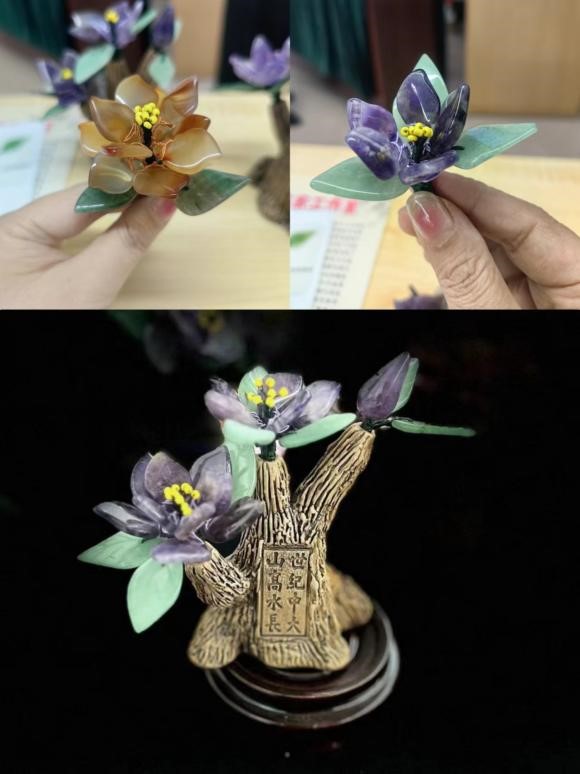 老师们精心制作的玉石花盆景,盆景底座镌刻“世纪中大、山高水长”字样